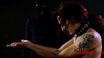 Redheaded bondage chicks in latex Mistress Scarlett and Nya whack and paddle guy's ass in dungeon